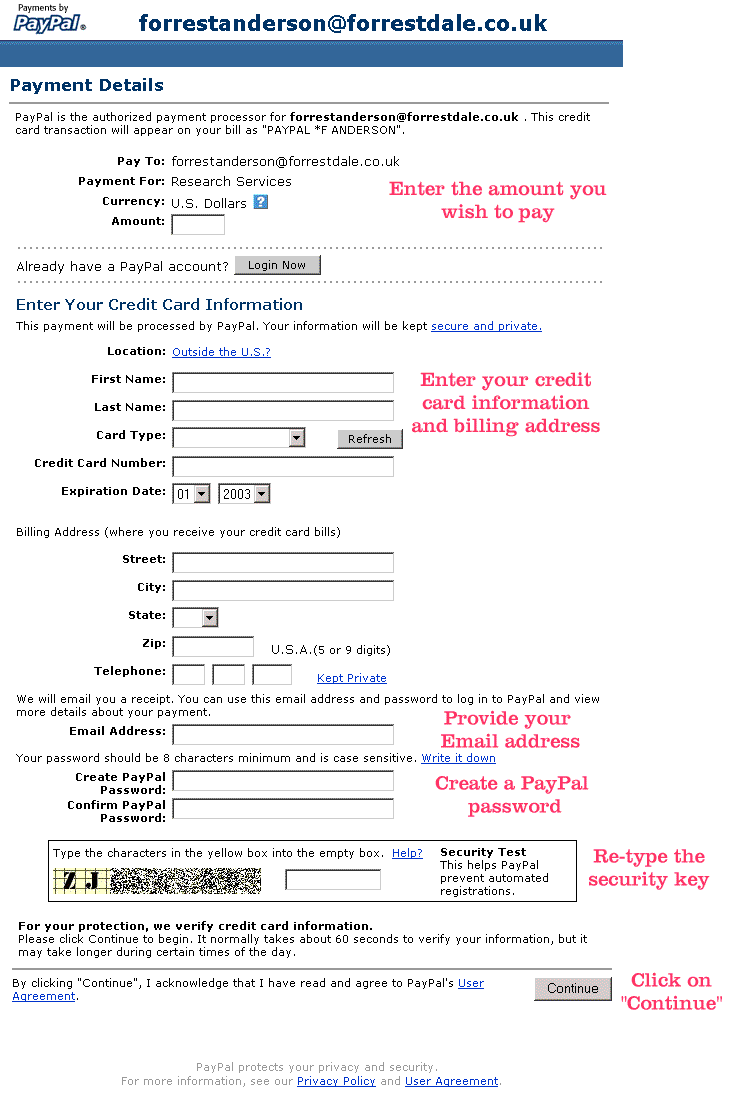 So that you can easily send me an ad-hoc payment or a donation for services rendered, I accept payment by Credit Card or PayPal. If you are a PayPal member, then you will probably have used PayPal to make payments before, and further instructions beyond Stage 1 will not be needed.